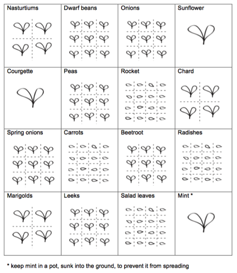 Now the fun begins – it's time to sow some seeds! Choose the vegetables you want to grow, and sow each variety into an individual square. The number of seeds sown depends on the size of the seed and emergent plant. So for broccoli, cabbage and courgettes sow one seed in the centre of the square. Chard and lettuces should be sown four seeds to a square. Beans, peas and beetroot need nine seeds – and for really tiny seeds, like carrots, spring onions, radishes and rocket, sow 16 seeds.